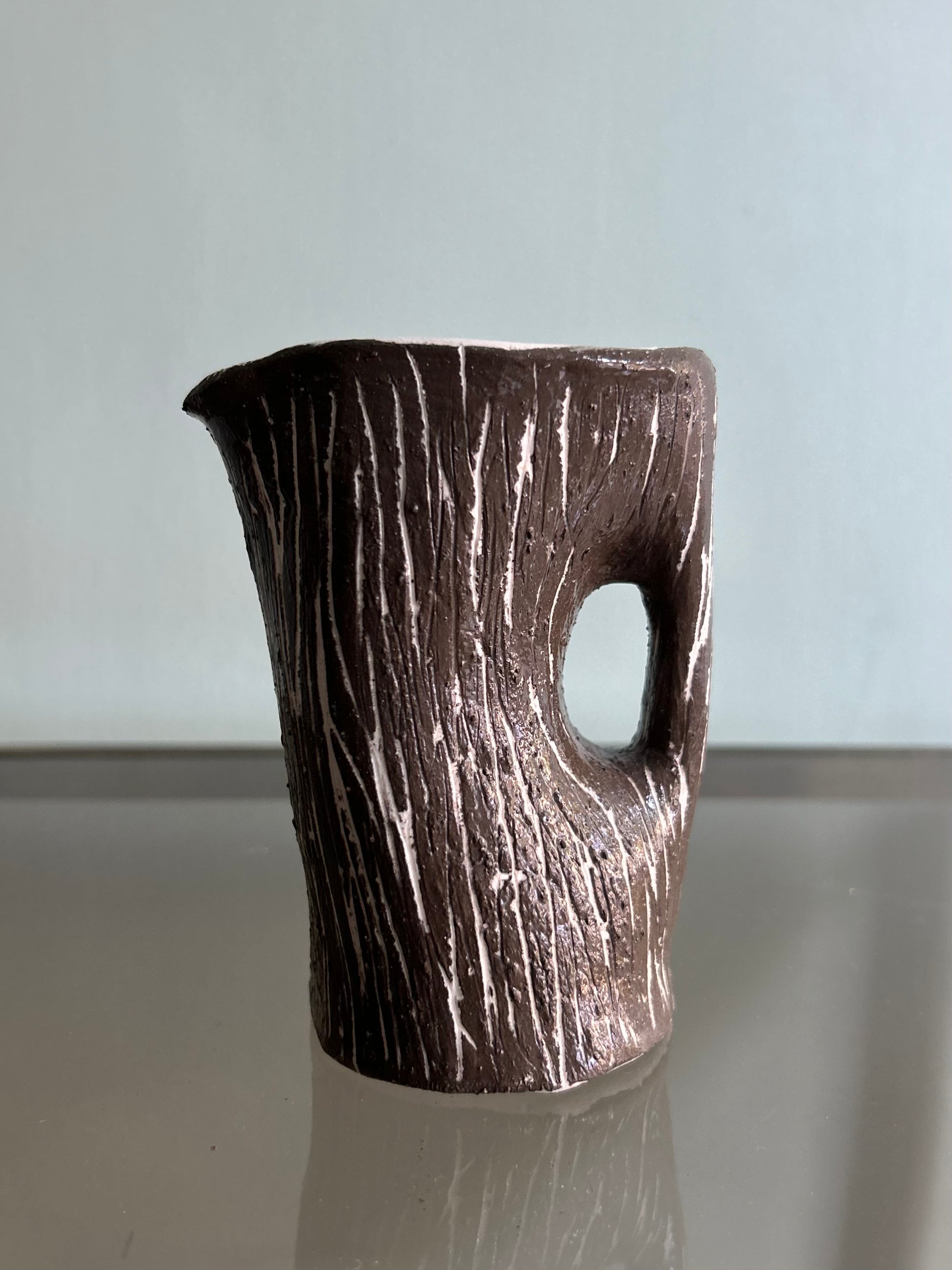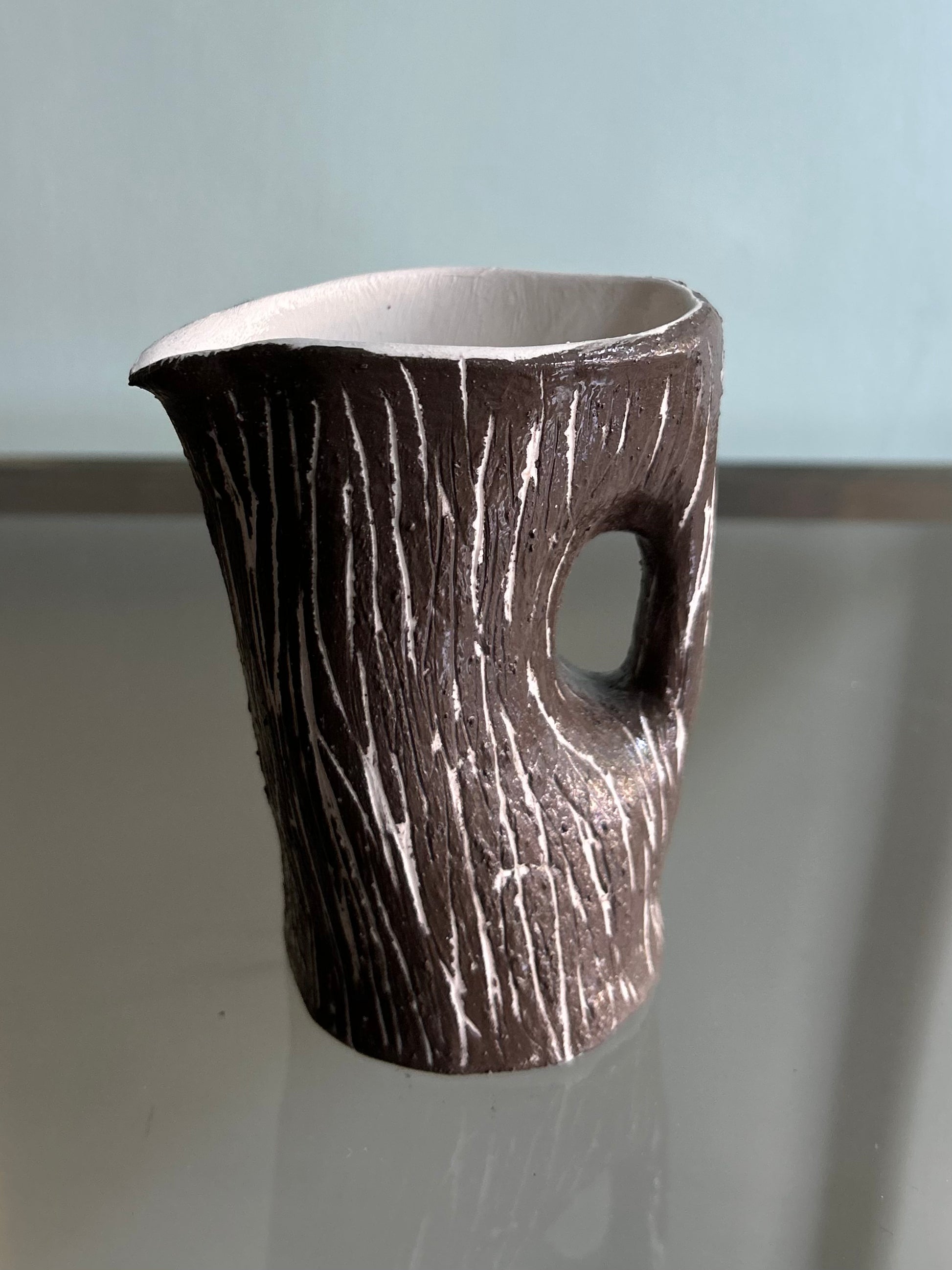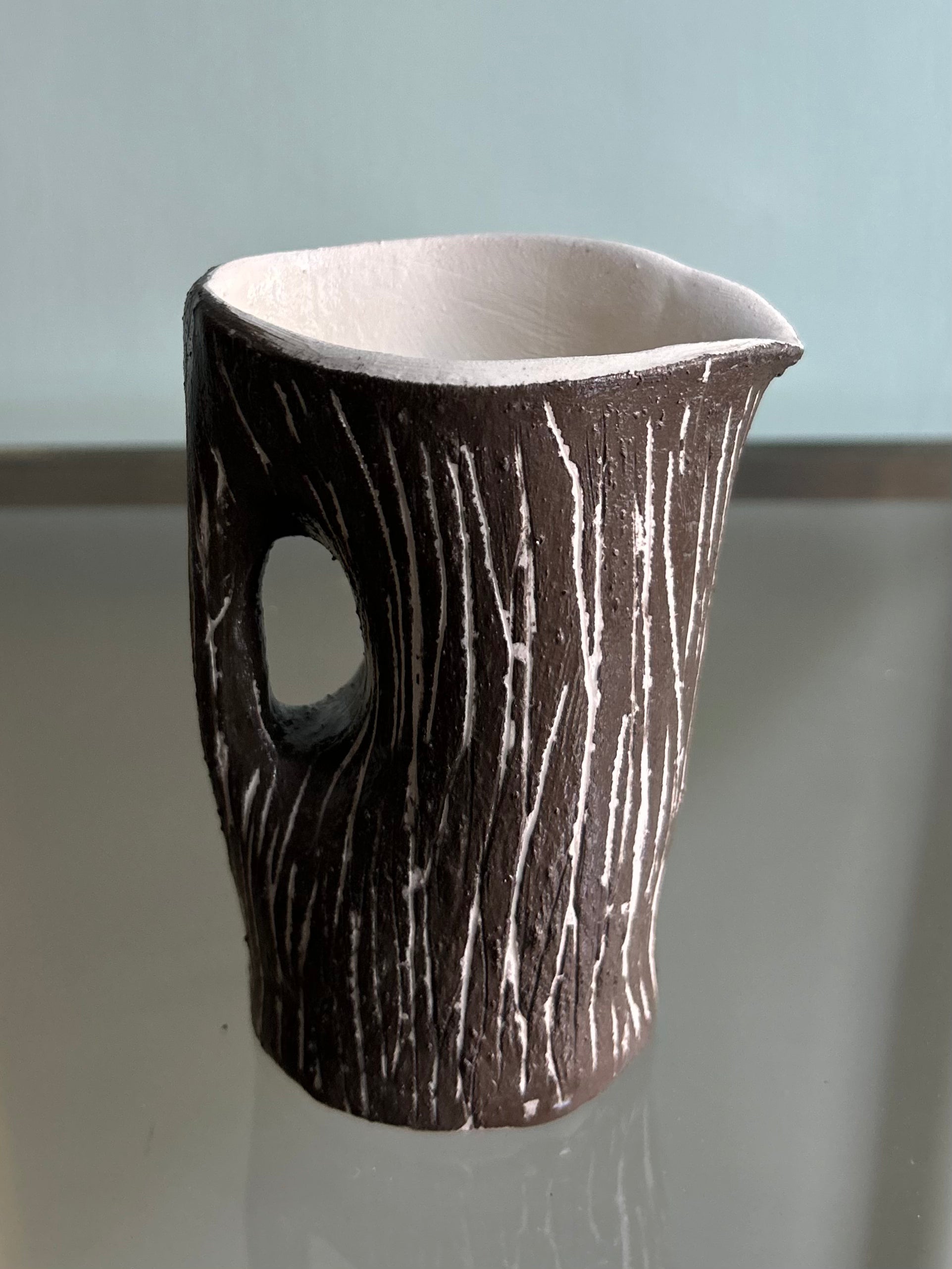 Piccola brocca di ceramica realizzata a mano in argilla bianca con scanalature su argilla raku nera.