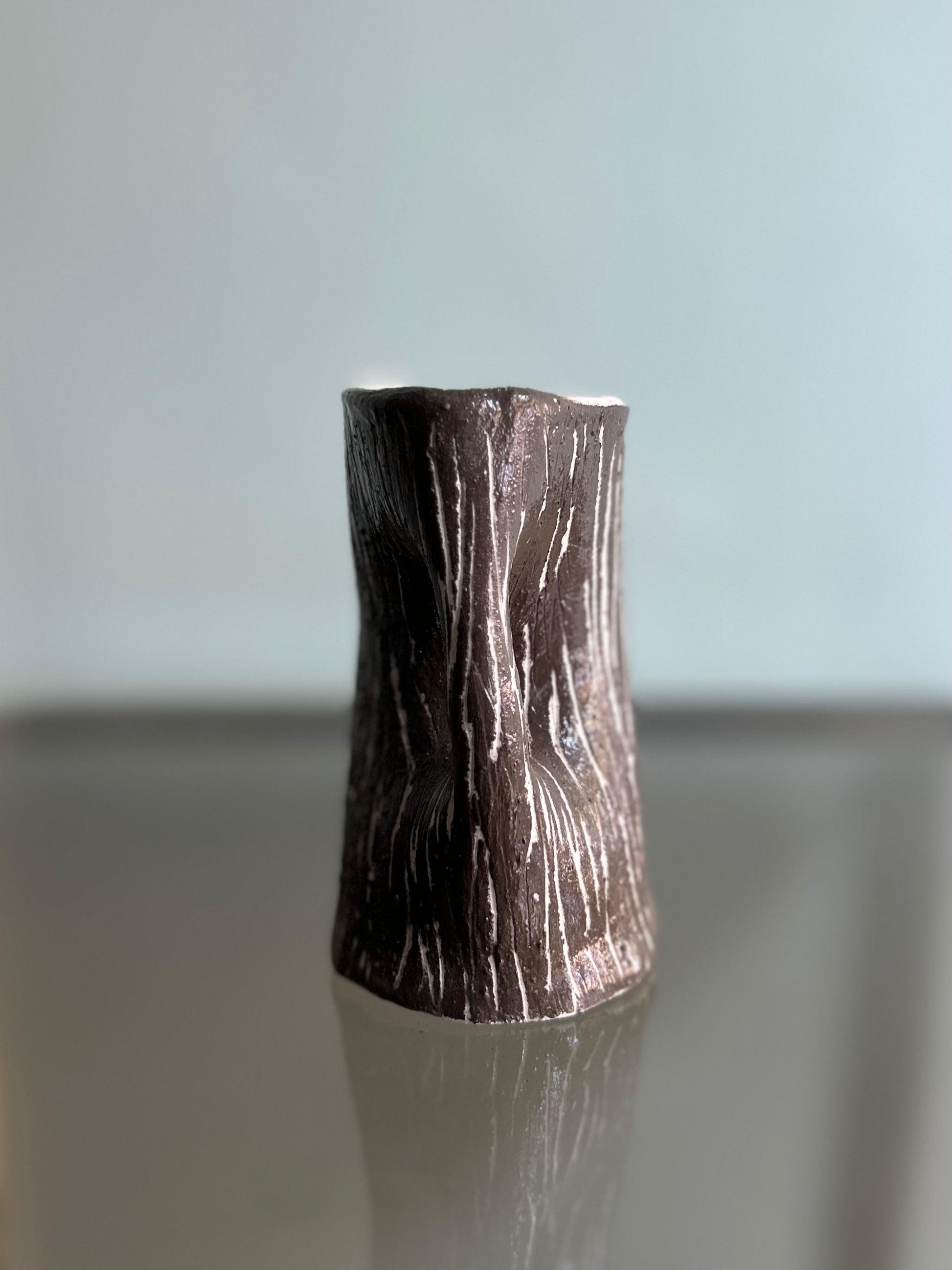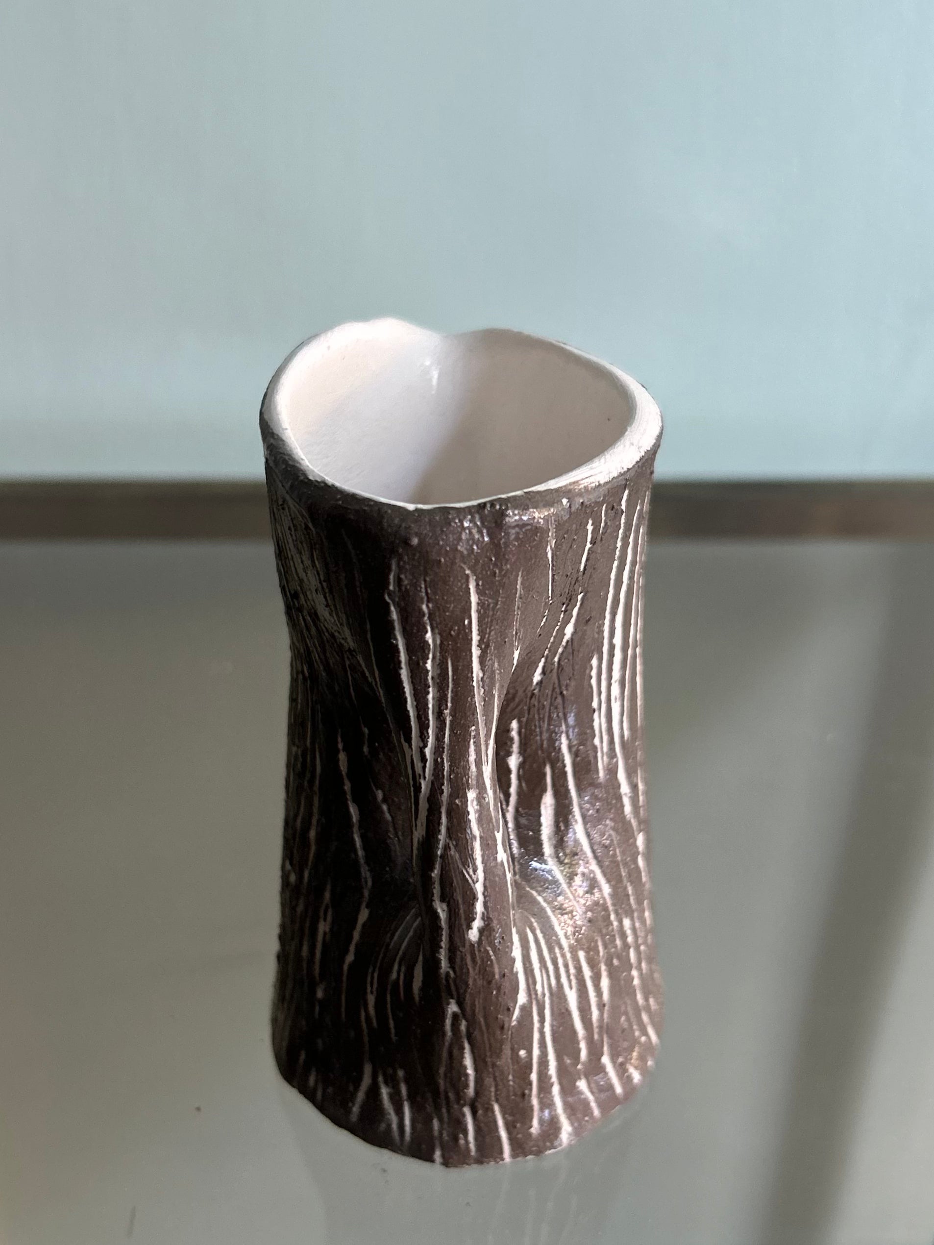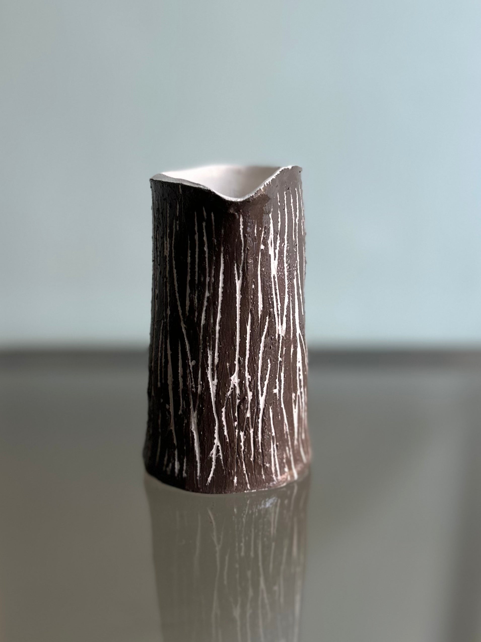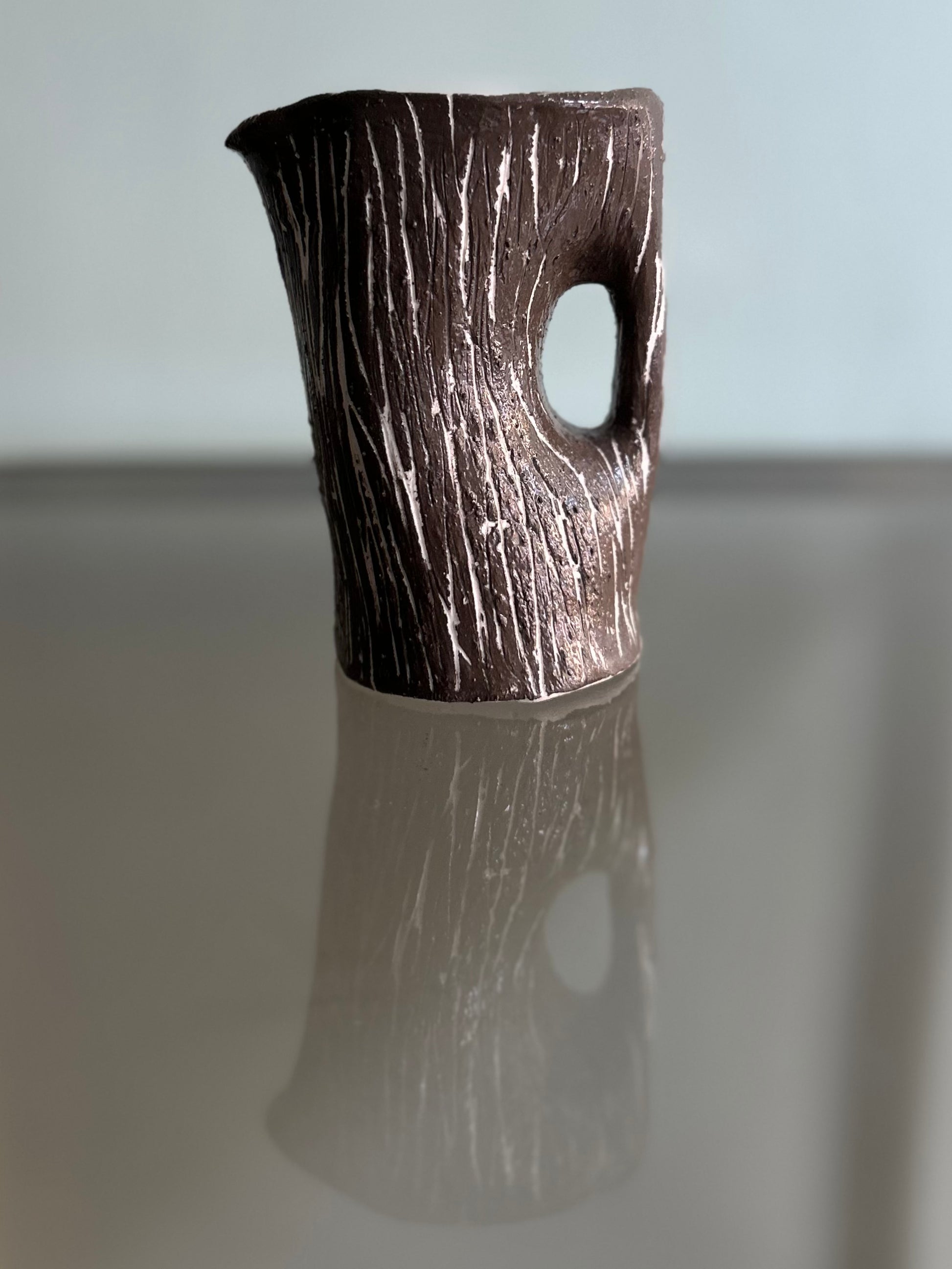 Piccola brocca di ceramica realizzata a mano in argilla bianca con scanalature su argilla raku nera.