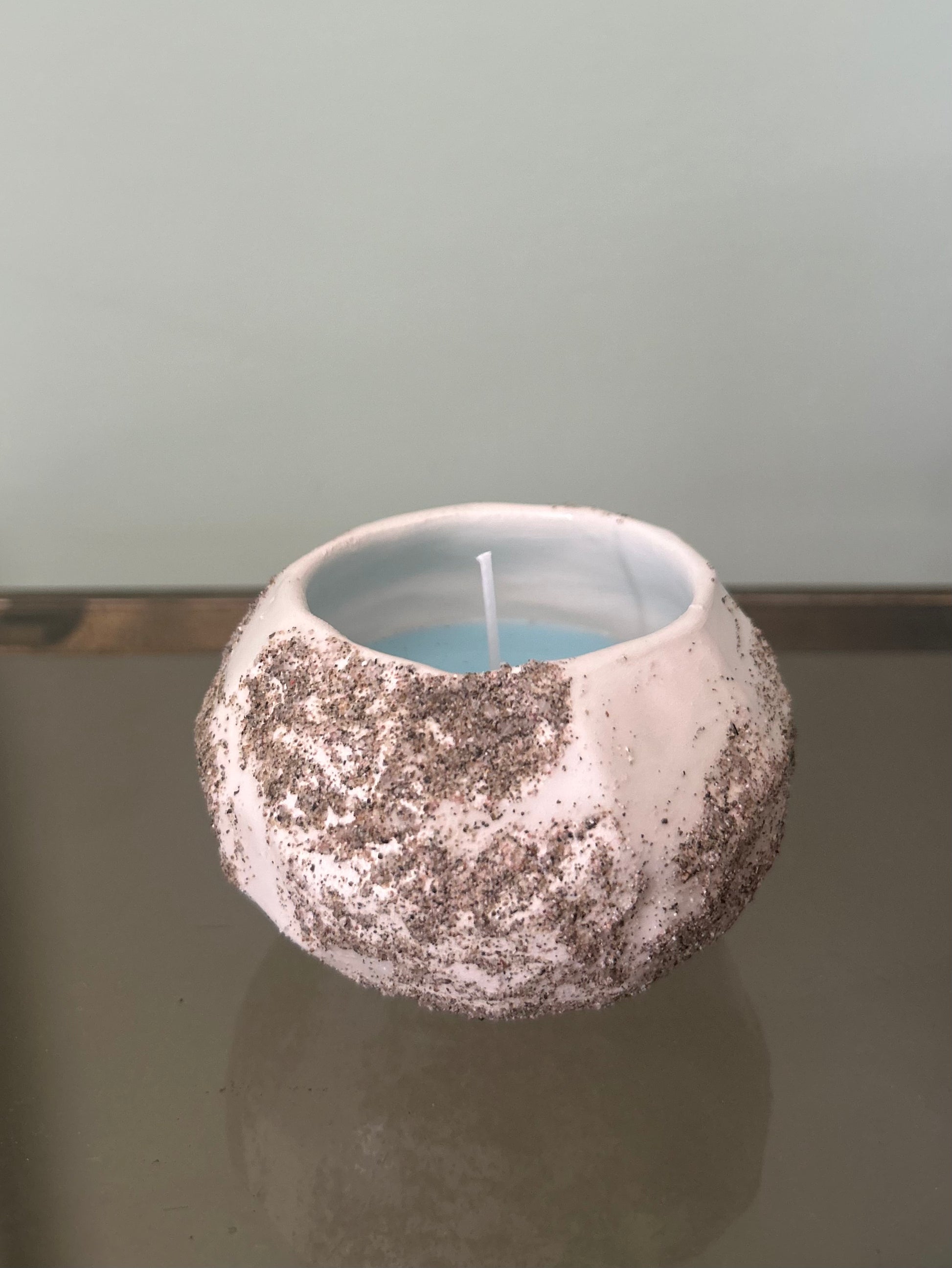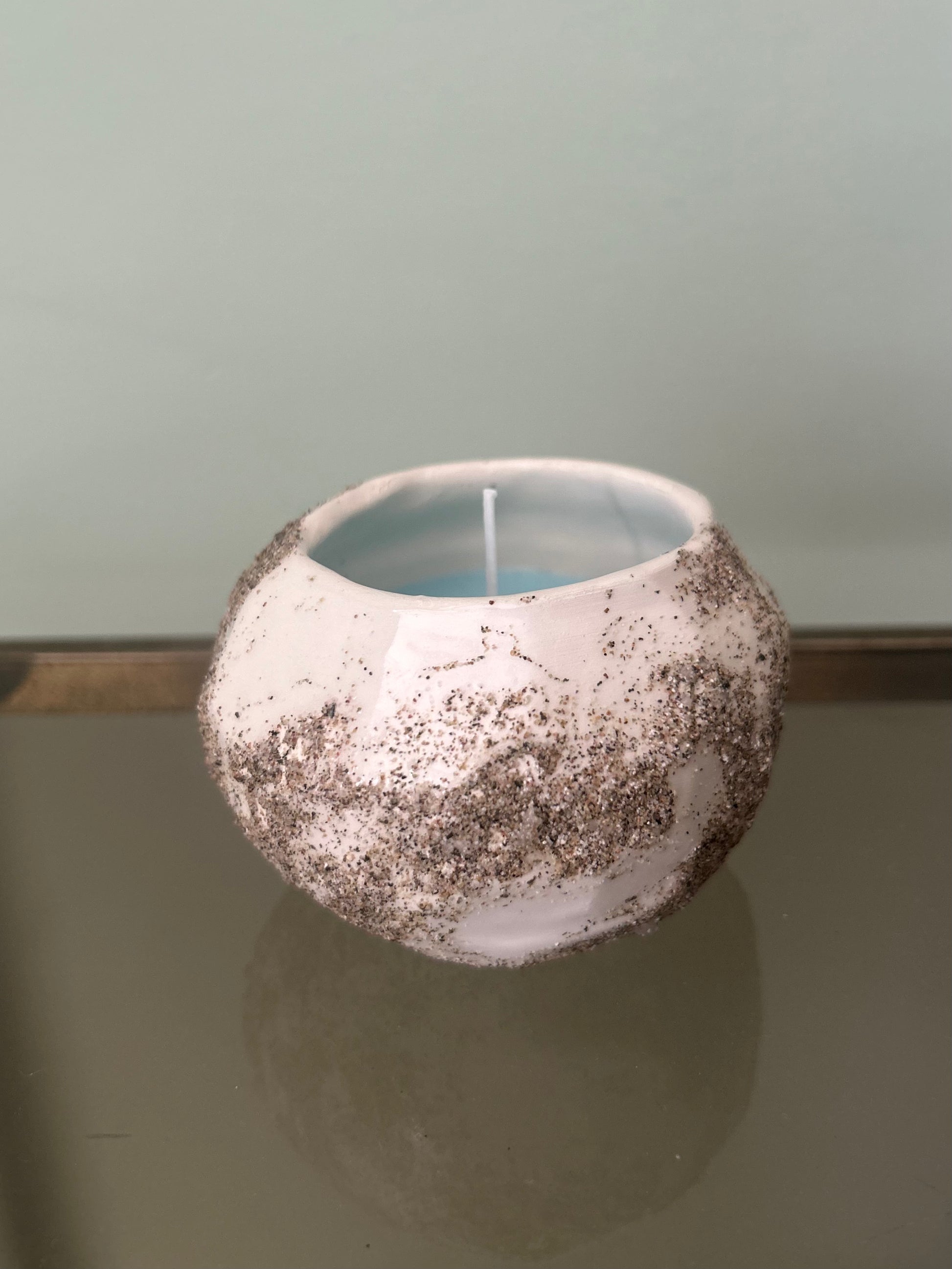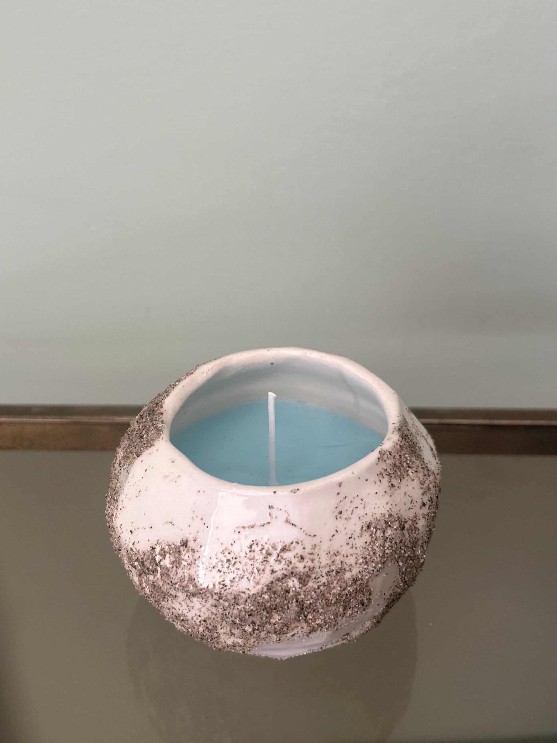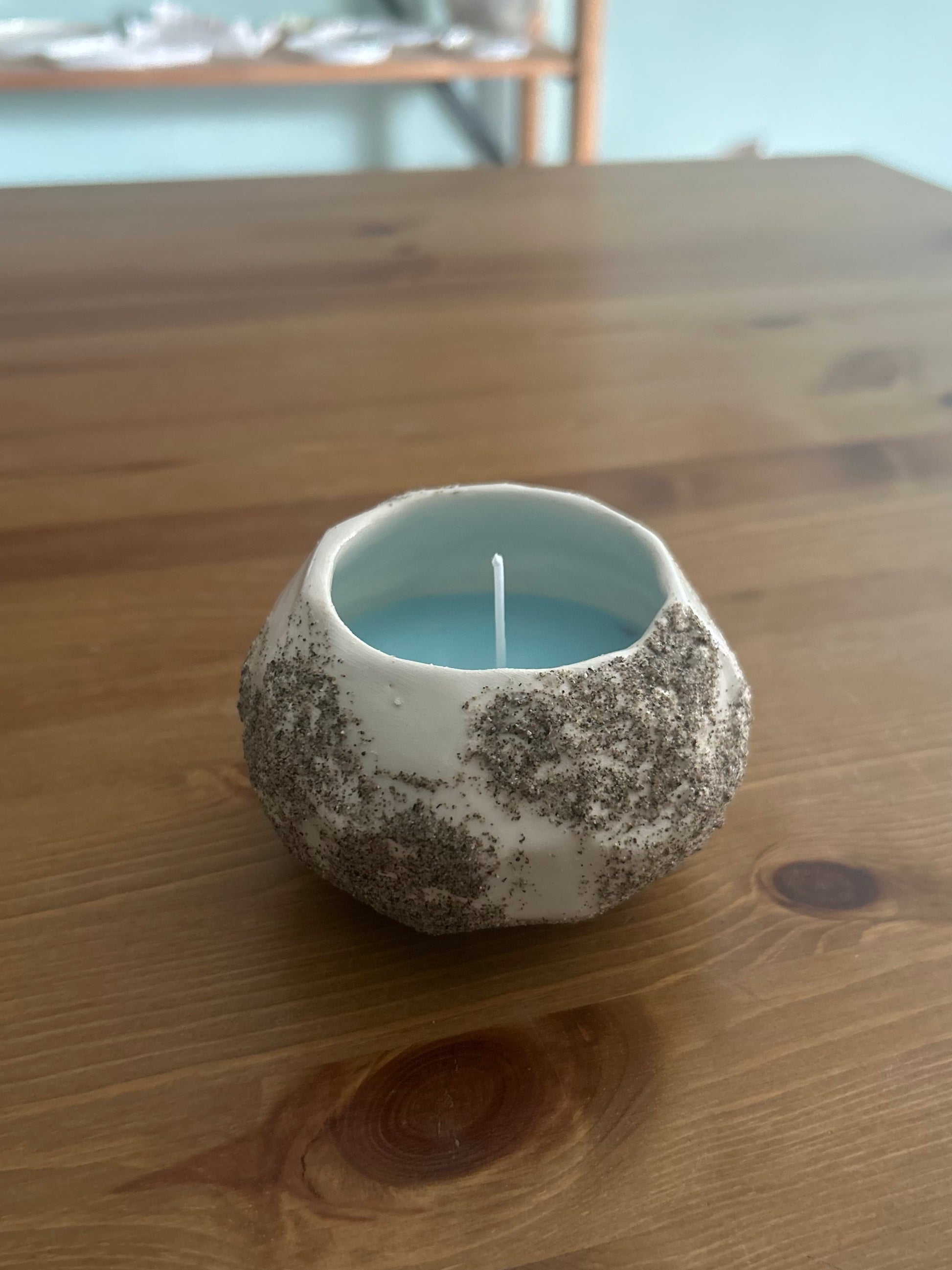 Candela in ceramica realizzata a mano in argilla bianca con sabbia e cera di soia all'essenza dell'oceano