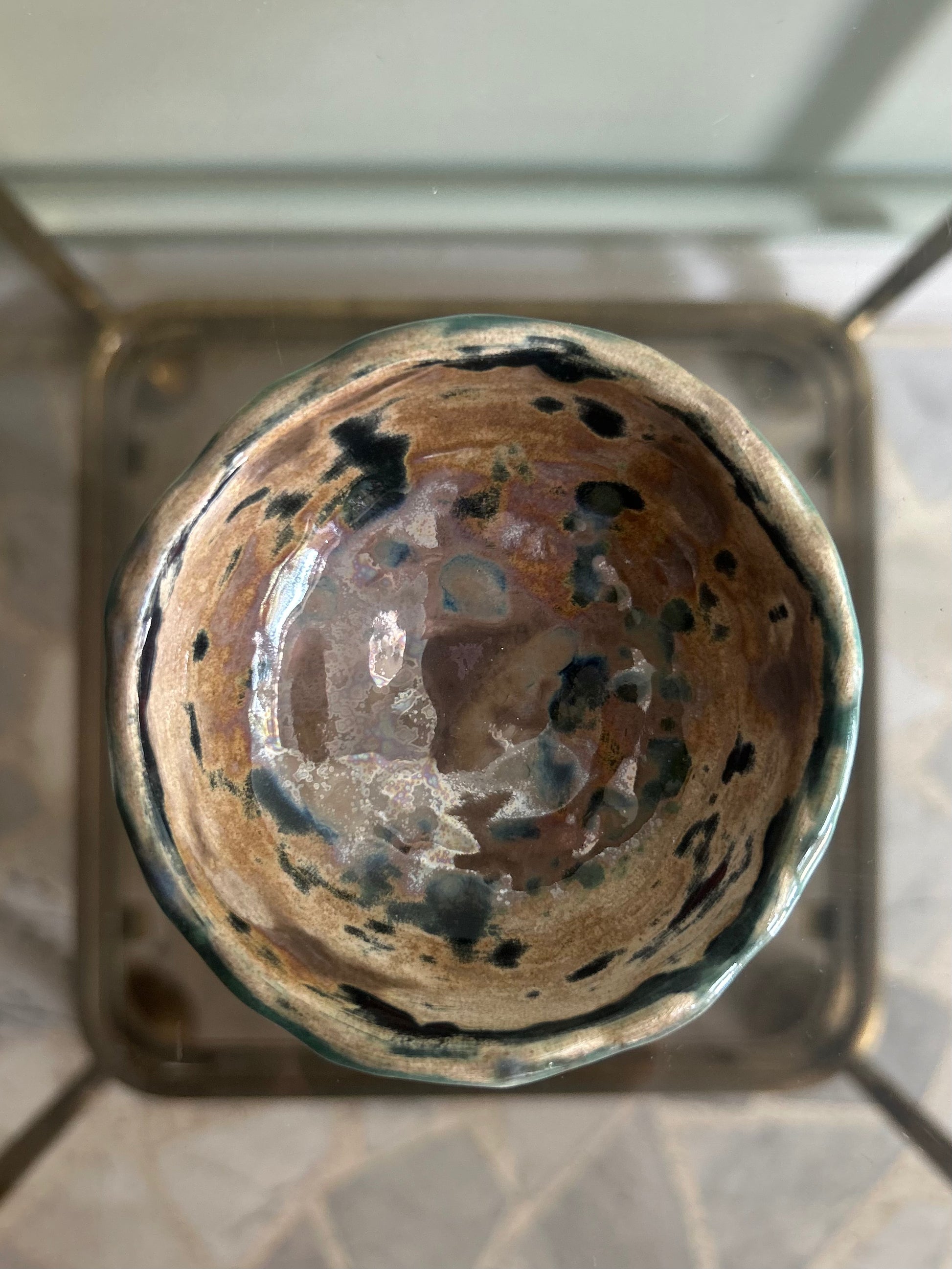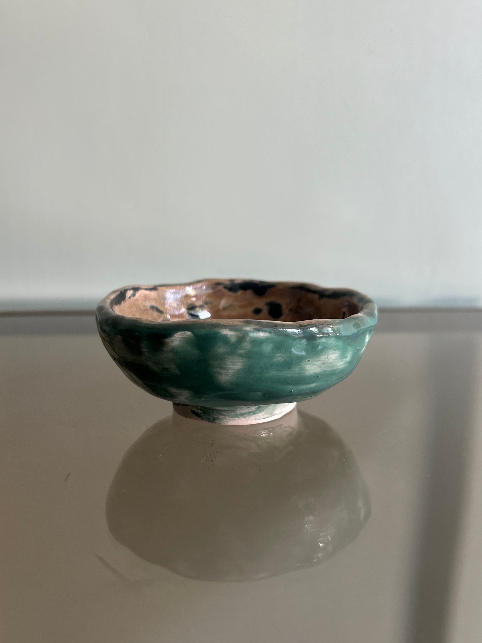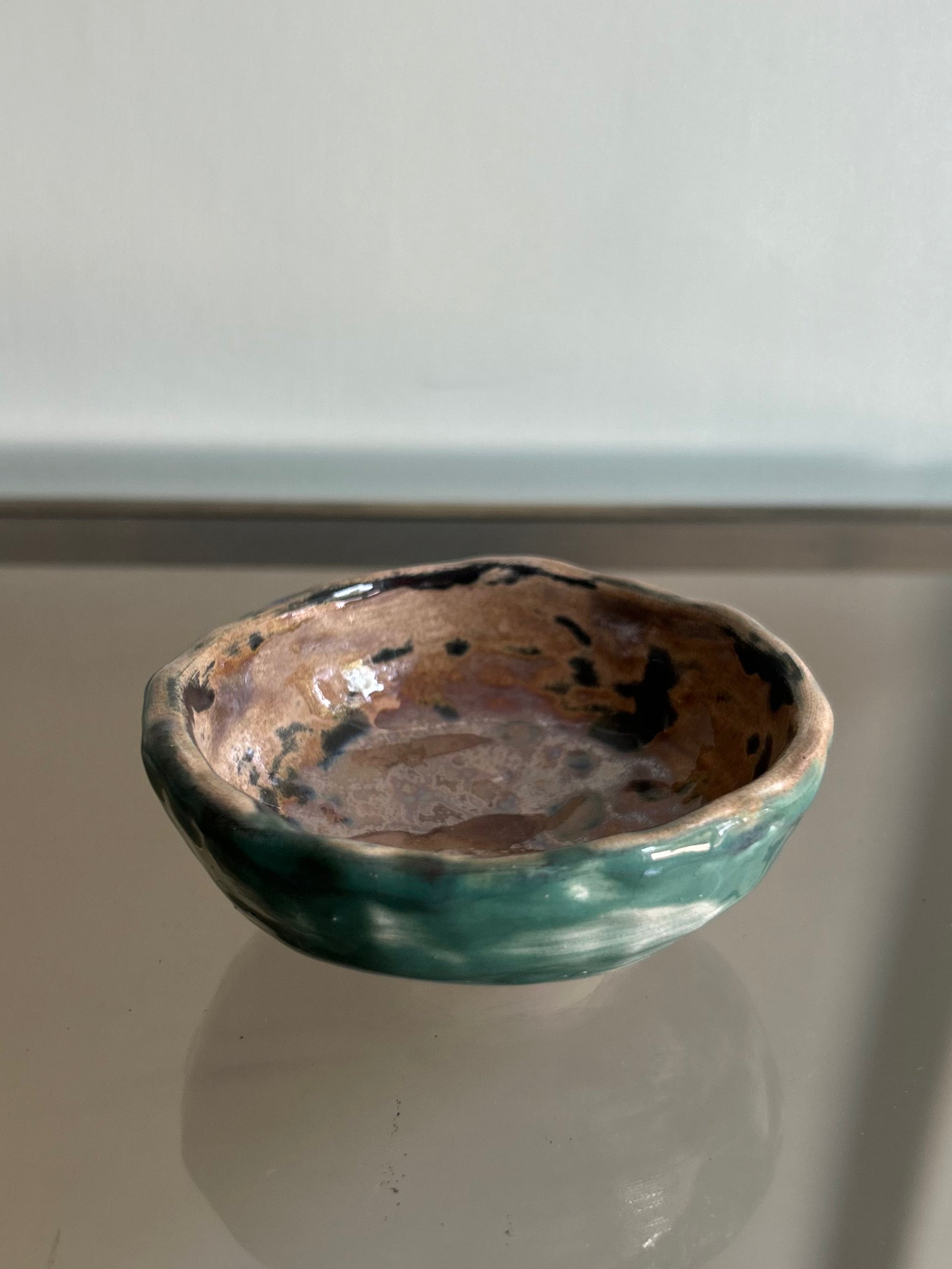 Piccola ciotola realizzata a mano in argilla bianca decorata con smalto acqua marina e ramato, non adatto per alimenti.