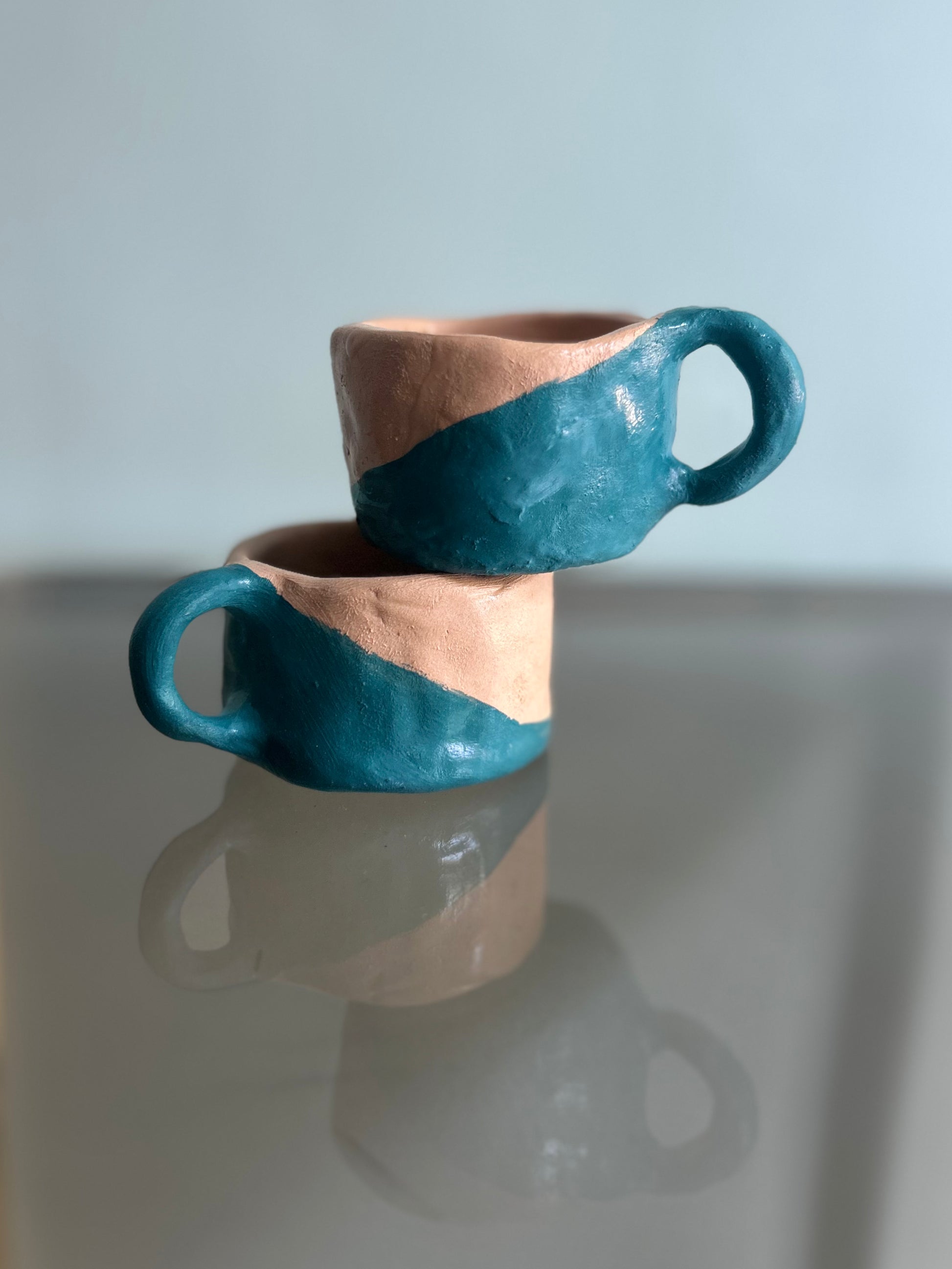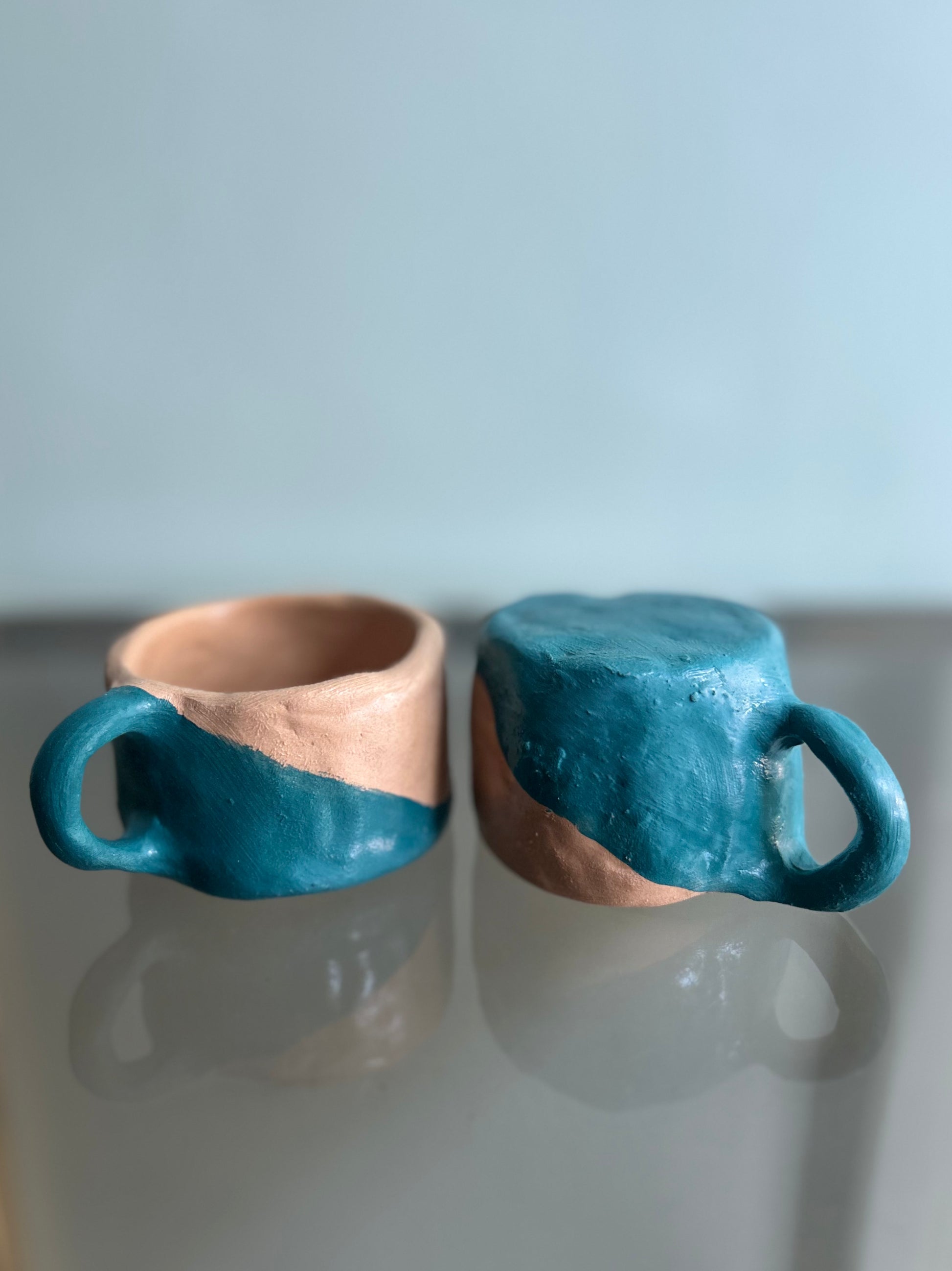 Coppia di tazzine realizzate a mano in argilla rossa bicolore, adatte per alimenti.