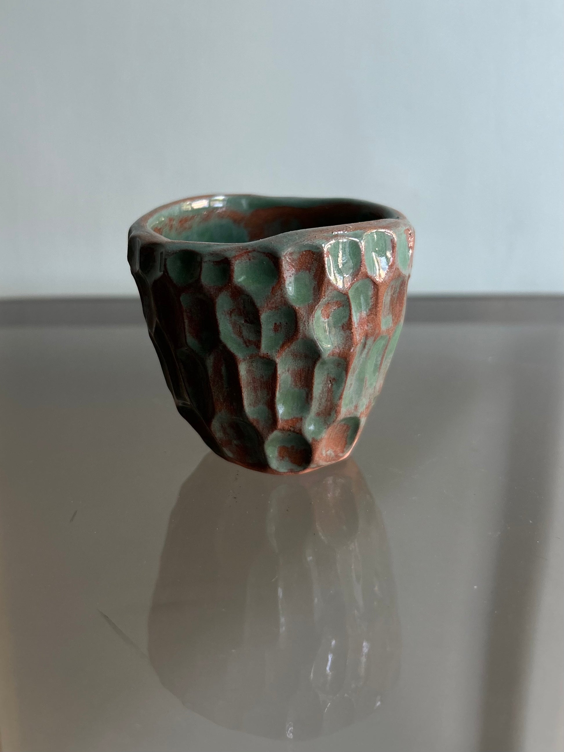 Tazzina realizzata a mano in argilla rossa decorata con smalto verde acqua e scanalature, adatta per alimenti.