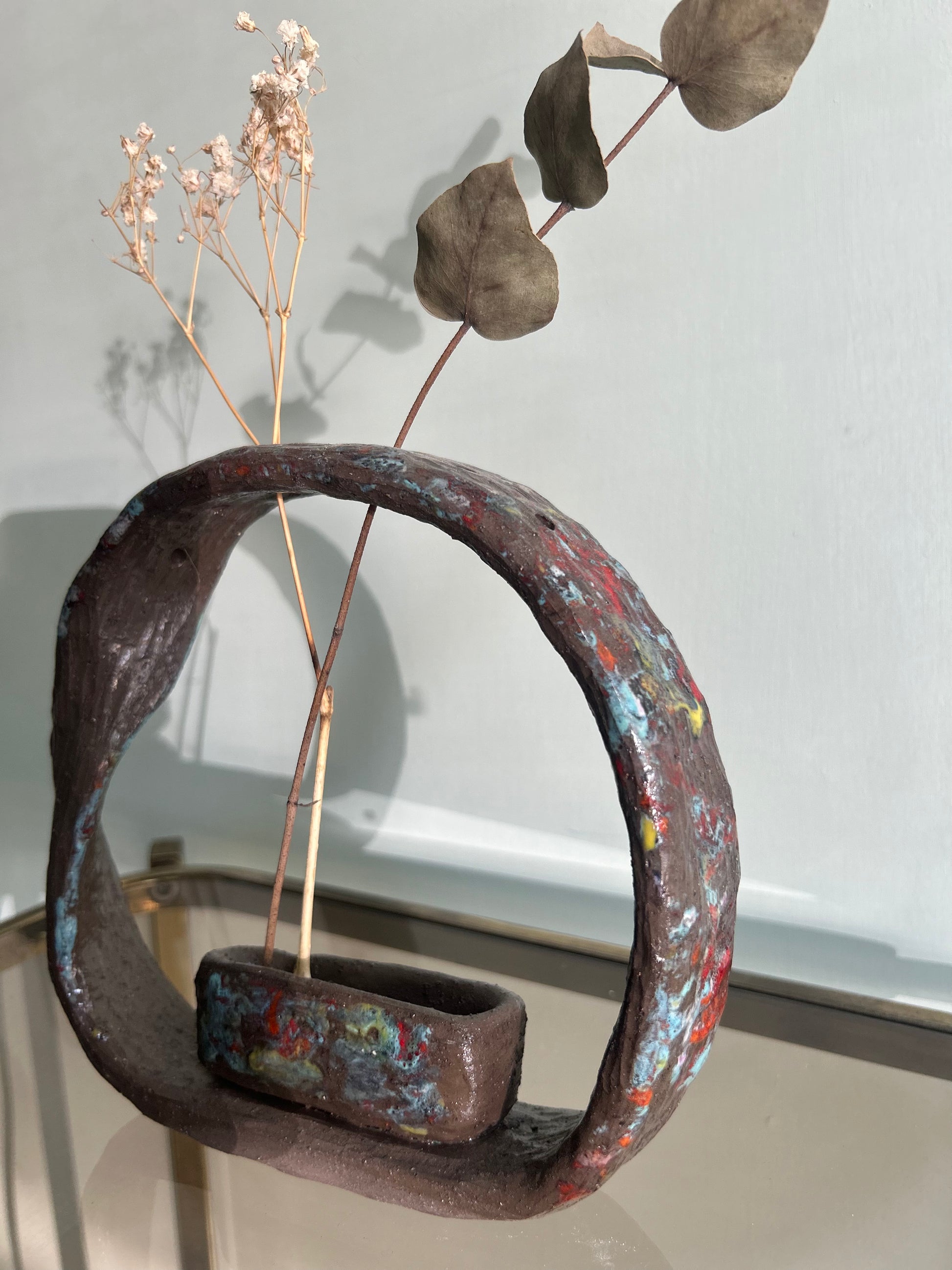 Vaso di ceramica porta fiori realizzato a mano in argilla nera raku con decorazioni create con smalti colorati.