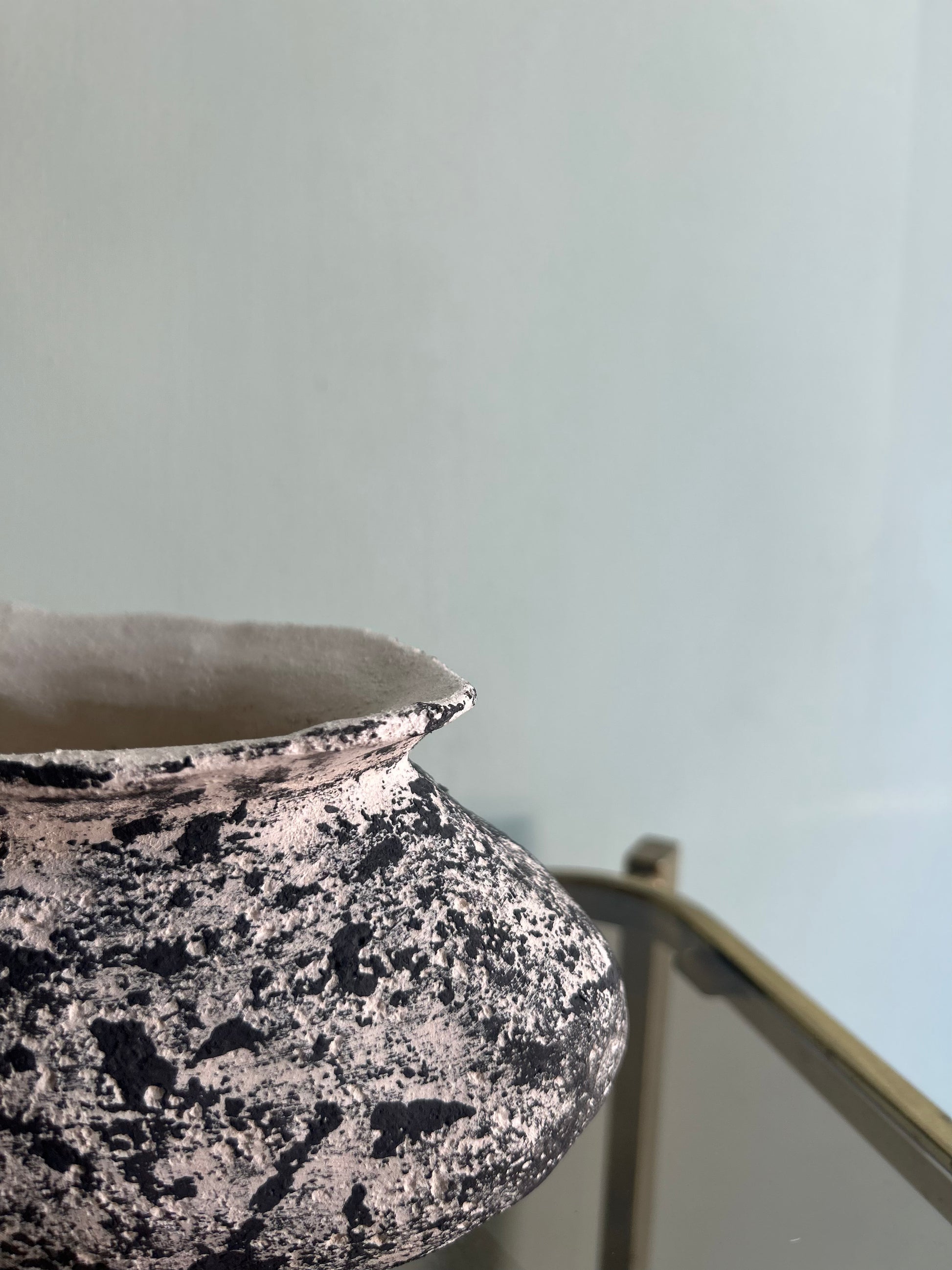 Vaso di ceramica realizzato a mano in argilla bianca refrattaria decorato con sotto cristallina nera.