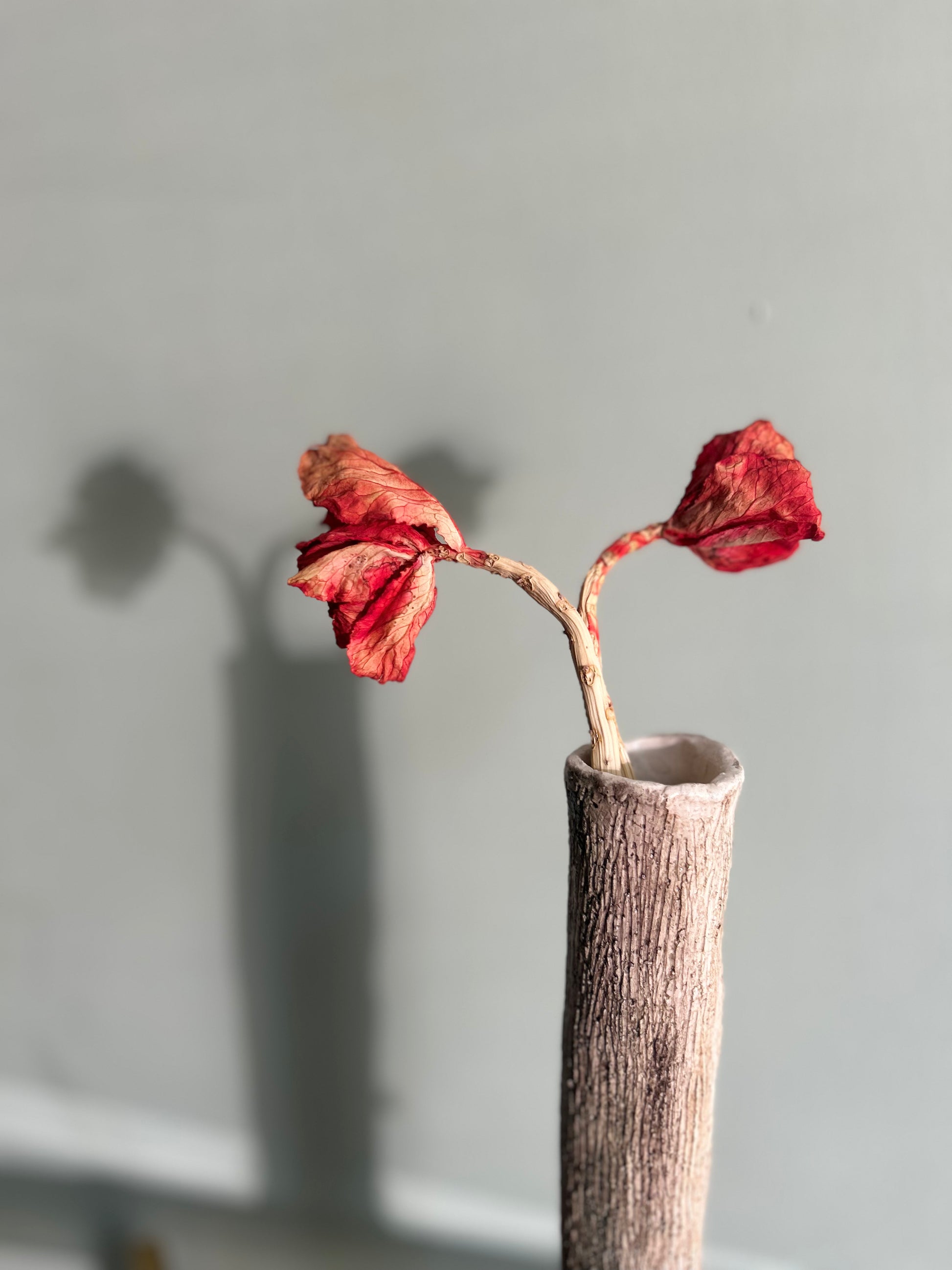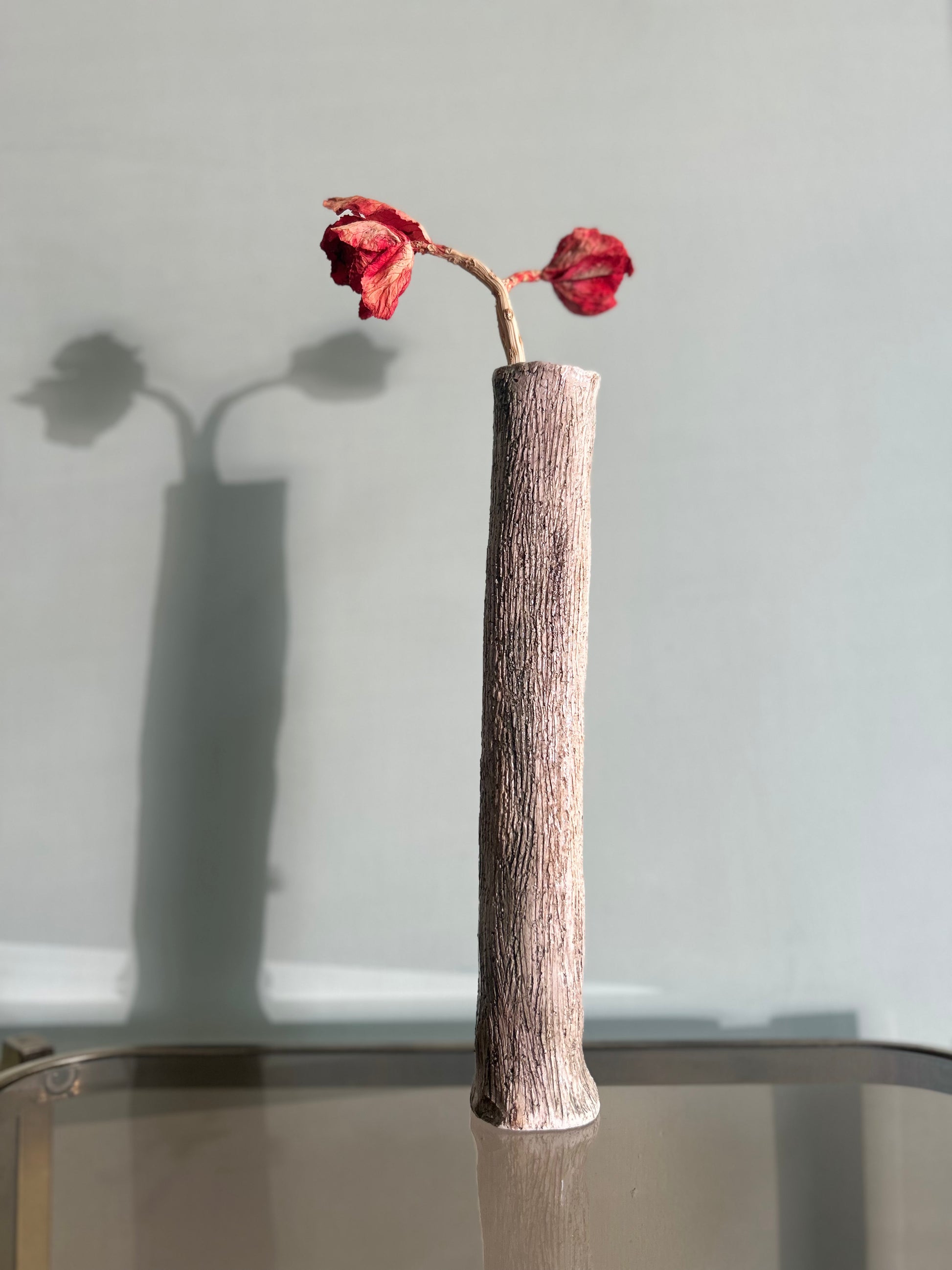 Vaso di ceramica porta fiore realizzato a mano in argilla bianca refrattaria decorato con smalti sfumati, toni neutri.